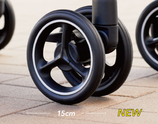 地面との接地点が多く安定性のある15cmの大径ダブルタイヤで、段差の乗り越えやすさをサポート。斜面や悪路でも安定して押すことができる。※
