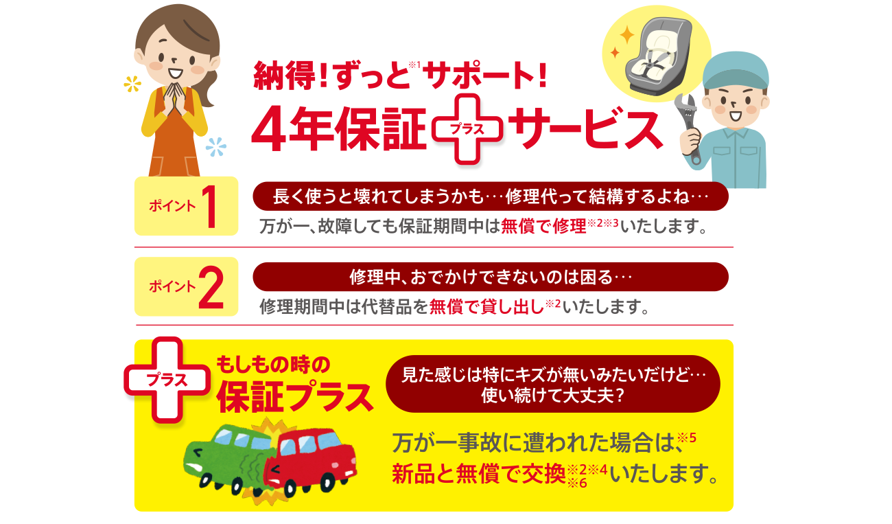 ※4 製品対象年齢 新生児から4歳頃までの使用期間が約4年間であることに基づく。保証期間は購入日より4年間です。