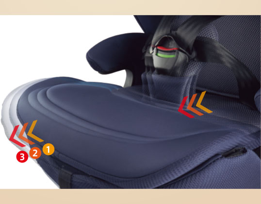 成長に合わせて座面の長さを3段階に引き出せ、太ももの裏を支えます。股ベルトも座面と連動し、大きくなる体型にフィットしてゆったり座れます。