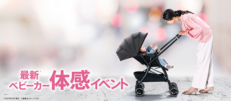 イベントでは、振動を吸収する「オメガクッション」、衝撃から守る「ショックレスマモール」、ベルト装着がカンタン「イージーベルト」、そして新機能「フィットリクライニング」など最新ベビーカーならではの機能を体感できます!