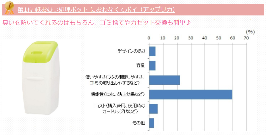 日本最大級の妊娠・出産・育児の情報コミュニティサイト「ベビカム」にて、プレママ&ママを対象にしたベビカム調査隊で人気ランキングを実施。【おむつ用ゴミ箱 人気ランキング】と【B型ベビーカー 人気ランキング】で、「におわなくてポイ 消臭タイプ」、「マジカルエアー」シリーズが第1位を獲得しました!