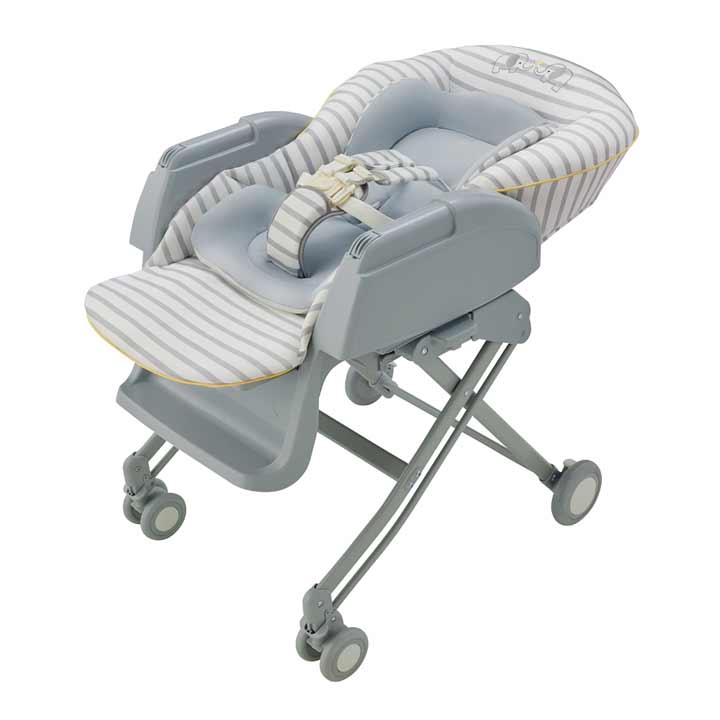 「ユラリズム スマート」シリーズは、ベッドのときはゆったり静かなスウィング、リクライニングがステップと連動し、イス時は膝が自然に曲がる設計。そして、厚みがあって心地いい「ふわふわクッション」で快適。 さらに、プレミアムモデルは、取り外し可能な洗えるトレイ付き。※2