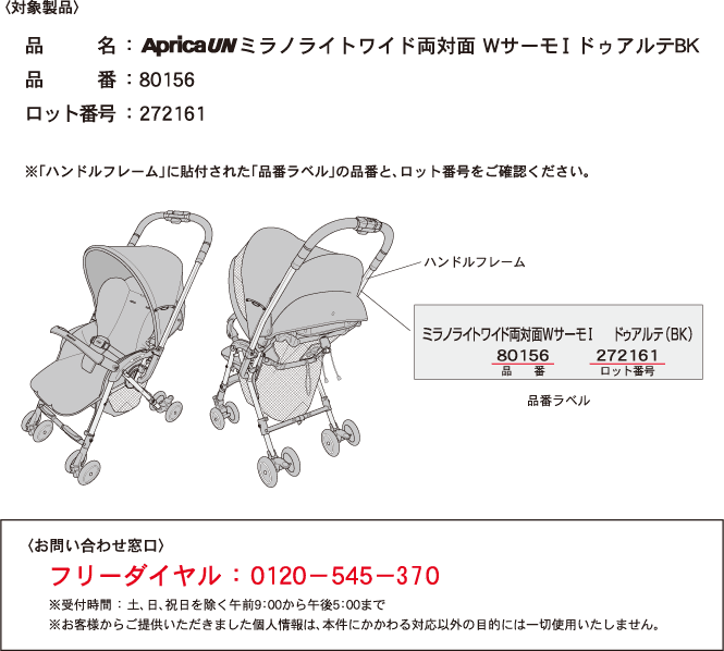 この度、弊社製ベビーカー「ApricaUN ミラノライトワイド両対面WサーモⅠ ドゥアルテBK(品番:80156)」の一部のロットにおきまして、ハンドル(押手)に使用している樹脂部品の強度が、社内基準を満たしておらず、使用によりハンドルの中央部付近が折損するおそれがあることが判明いたしました。