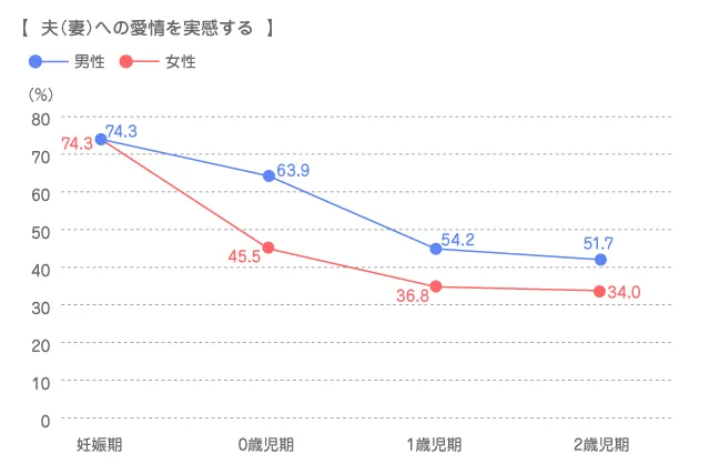 これによると、「夫(妻)への愛情を実感する」と答えた人は妊娠期には夫・妻ともに74.3%なのが、2歳児期ではなんと夫51.7%、妻34.0%にまで下がりました。しかも専門家によれば産後にいったん下がってしまった愛情はその後、ほぼ回復することがないといいます。調査を行ったお茶の水女子大学の菅原ますみ先生によると、アメリカでは男女同じように下がるということで、「女性の下がり方の著しさ」は日本独特の現象とのこと。菅原先生は『日本の男性の家事育児に費やす時間が世界的にみて最低の水準にあることが関係している』と指摘されています※2。