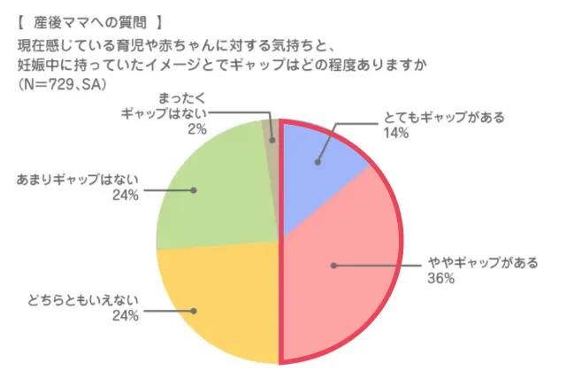 現在感じている育児や赤ちゃんに対するリアルな気持ちと妊娠中に持っていたイメージとのギャップをたずねたところ、「とてもギャップがある」「ややギャップがある」と回答した産後のママは、合わせて50%もありました。一方、「まったくギャップがない」と回答した方は、わずか2%でした。