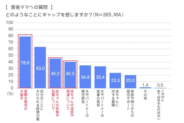 では実際に、どのようなことにギャップを感じているのでしょうか?最も多かったのは、「実際の育児の大変さ」の78.6%でした。また、「赤ちゃんの性格や気質について」や「赤ちゃんの成長や発達について」など、赤ちゃん自身への理解が、産前と産後ではイメージが異なるという回答も目立ちました。「思っていたのと違う」という育児イメージのギャップが育児不安やストレスを助長しているとも考えられます。