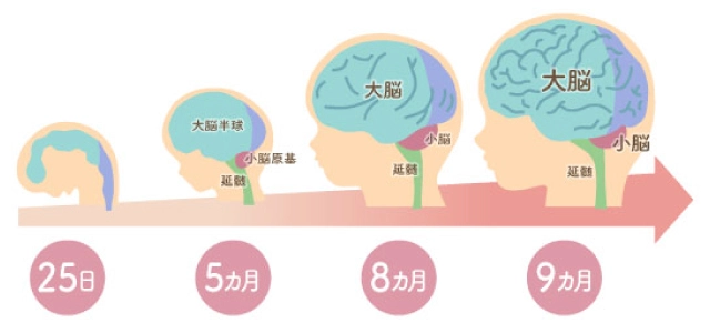 赤ちゃんの脳がつくられ始めるのは、在胎18日ごろからと言われています。在胎24週(6カ月)くらいまでに、脳はぐんぐんと大きくなりますが、表面にしわがなく、のっぺりしています。在胎28週(7カ月)に入ると大脳の表面にしわや溝がたくさんできて、在胎36~40週(9~10カ月)ごろには大人の脳とほぼ同じ外観をもつようになります。