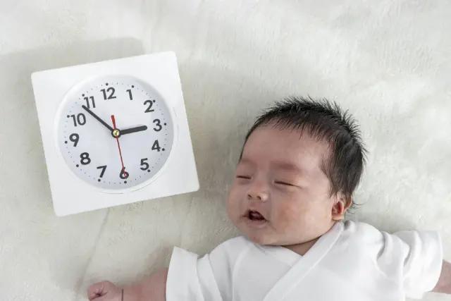 生まれたばかりの赤ちゃんは、まだ1日のリズムの体内時計が働いていないので、昼と夜の区別なく寝ていますが、2カ月頃になるとこの体内時計が働き始めます。3~4か月頃になると昼夜の自然のリズムや周囲の人の刺激に影響されるようになり、地球時間とのずれを調整できるようになります。そして、2~4カ月頃までの間に急速に夜にまとめて長時間の睡眠をとれるようになり昼間の睡眠時間は減っていきます。