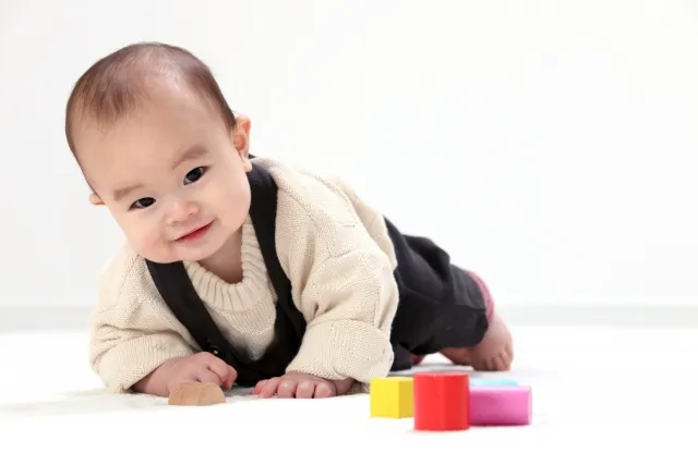 赤ちゃんが意欲的に自分で動くための原動力は、目に見えたものを触りたい、なめたいという気持ちです。一緒に遊ぶ時のおもちゃは、安全で、色や形や感触が豊かなものを選んでください。原色に近いはっきりした色のものがおすすめです。赤ちゃんが触れると形が変わったり、動いたり、音が出たりというわかりやすい変化や反応が現れることも大切です。床遊びには、ボールや筒などの転がる物も用意すると良いでしょう。