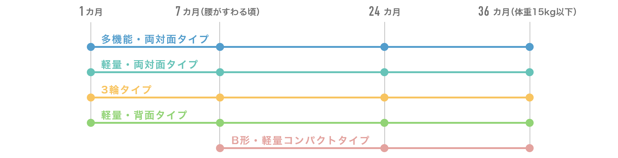 B形にはまだ早い。そんな時期のお子さまには、軽くて動かしやすいA形の軽量・背面タイプがおすすめ。