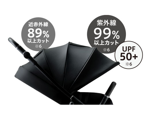 はっ水性があり、日差し・紫外線から守る※6 幌表と裏2枚合わせの部分において、近赤外線は波長800~2500nmにおいて。