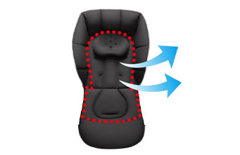 熱がこもりやすい座席の背もたれに「Wサーモメディカルシステム」を採用。通気口と反射板で風を通し熱をカットします。