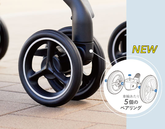 車軸を安定させ回転摩擦抵抗を少なくするベアリングを車輪あたり5個、合計20個も内蔵。押し始めが軽く、旋回性も向上。※