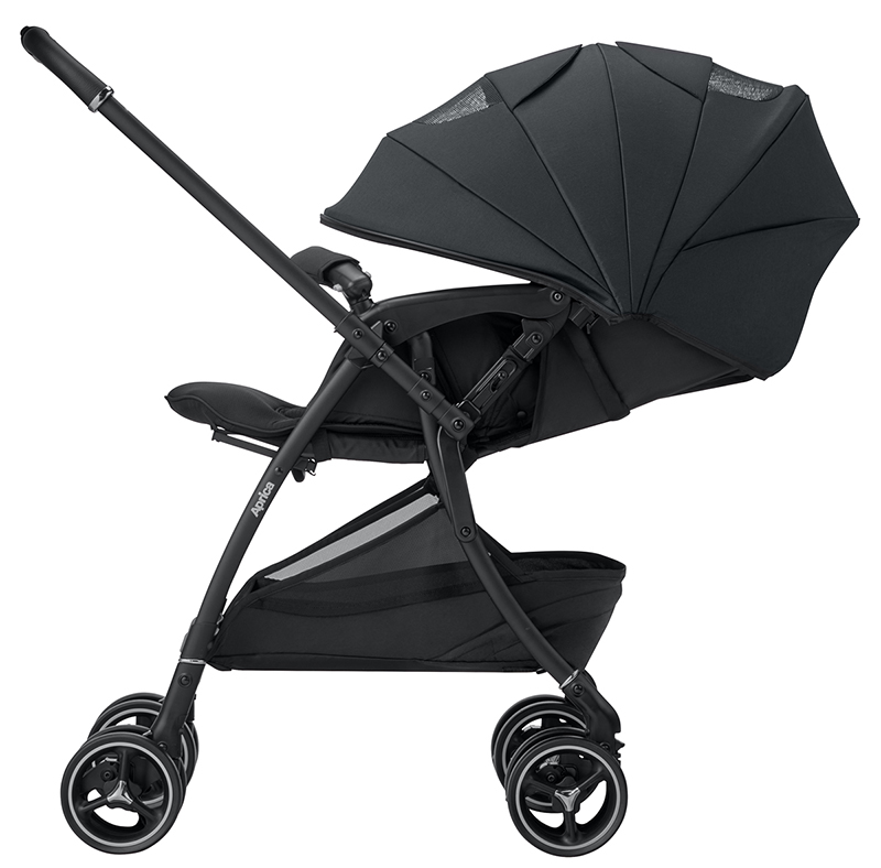 多方向からの日差しもカバーする大きなフード。2つの窓で、対面・背面どちらでもフードを閉じたまま赤ちゃんの姿を確認できます。