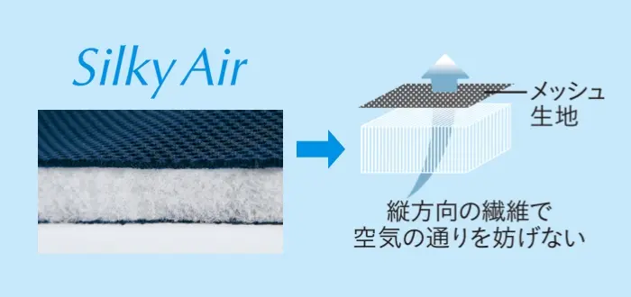 中の素材は通気性とクッション性を両立したシルキーエアー。取り外して洗える※6ので、いつも清潔に保て、肌トラブルの原因となる汗や雑菌から赤ちゃんを守ります。