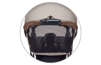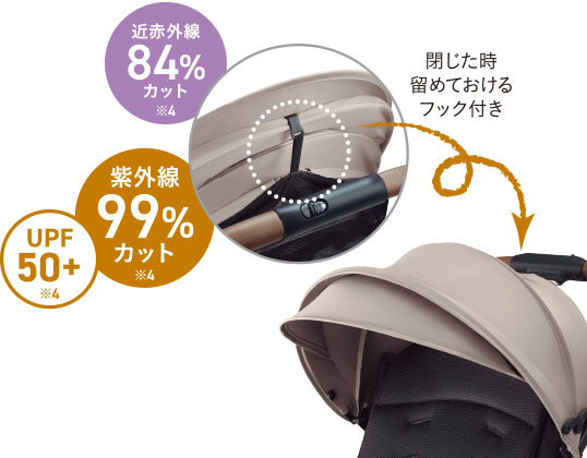 日差しをよける大きな幌は、閉じた時フックに留めておけます。