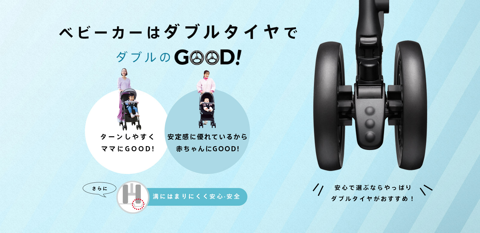 ダブルタイヤは地面との接地点が多い! ダブルタイヤとソフトサスペンションで小石のような路面でも安定走行可能で、赤ちゃんの揺れを軽減します。