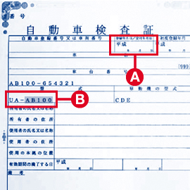 年式および型式を車検証の「初年度登録年月」A(軽自動車の場合は「初年度検査年月」)