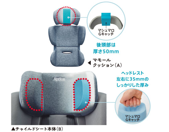 やわらかい赤ちゃんの頭を守る衝撃吸収材「マシュマロGキャッチ」。「マモールクッション(A)」だけでなく、 チャイルドシート本体(B)にも搭載されているので4歳頃まで赤ちゃんの頭を衝撃から守ります。