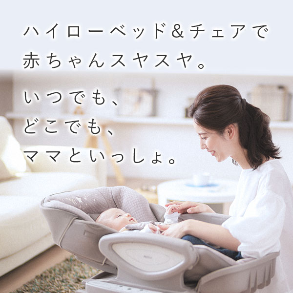 ゆったり静かなスウィングで、あやし・寝かしつけに大活躍。6段階高さ調節で、リビングでも使いやすい。キャスター付きで、ラクラク移動。イスにもなって4歳(48カ月)まで。ハイローベッド&チェアは、こんなに使えるママの味方です。