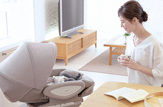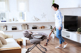ママの代わりに赤ちゃんを揺らしてあげる電動スウィング。スピードやゆれ方のモードを選ぶこともできます。