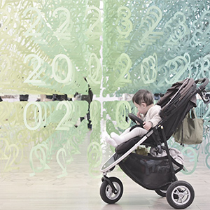 大きなタイヤが頼もしい、3輪ベビーカー「スムーヴ」はデコボコ道でも振動を吸収。