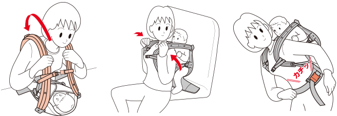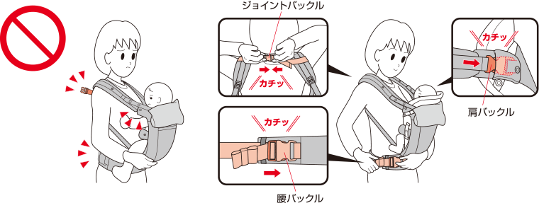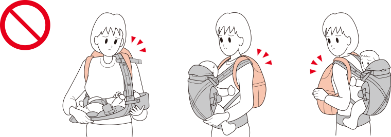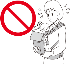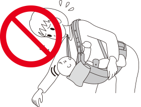 ● タテ抱っこ、おんぶ、前向き抱っこ、腰抱っこ時は、お子さまが反り返った状態、体を丸めて抱っこひもに潜り込んだ状態、両足が外に出ていない状態では使用しない。