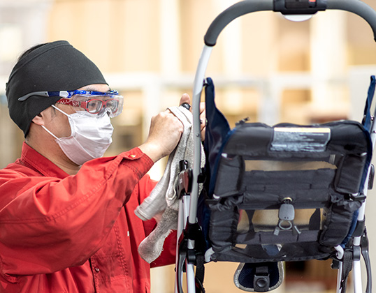 不具合があったベビーカーは、すべて国内のサービスセンターでお預かりし、研修を終えて認定試験(社内基準)に合格した技術者が丁寧に修理・メンテナンスを行っています。