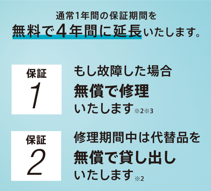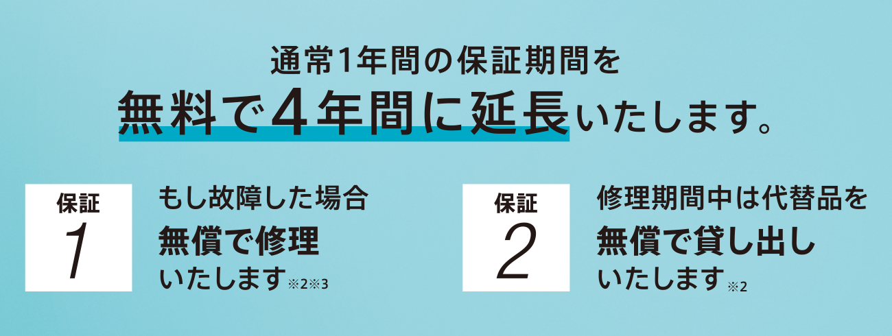 ※2 保証期間は購入日より4年間です。2年目以降の送料は別途申し受けます。保証の範囲や条件については保証規定をご覧ください。
