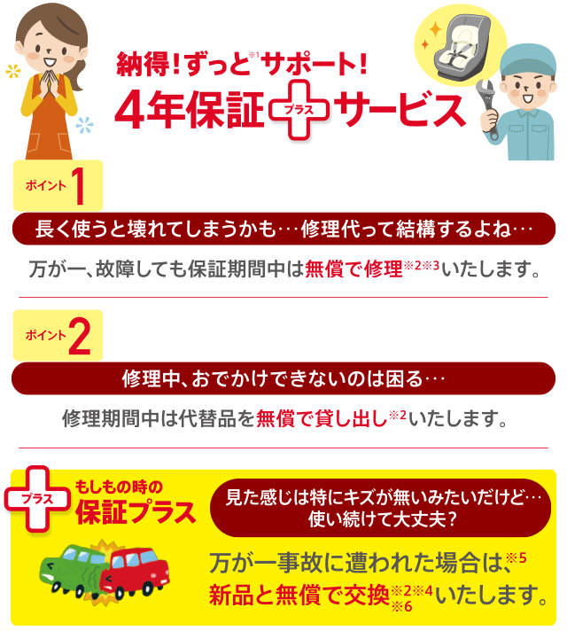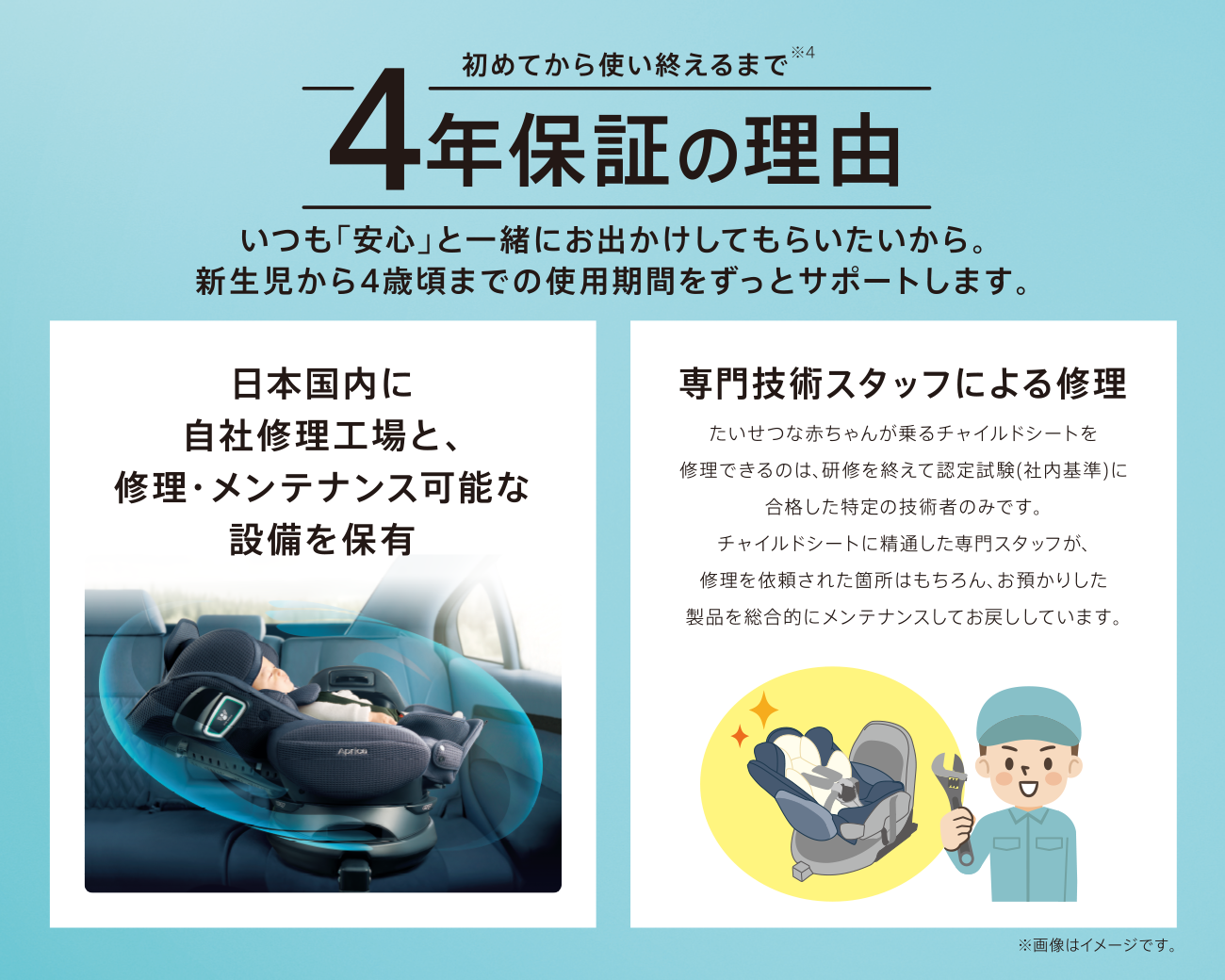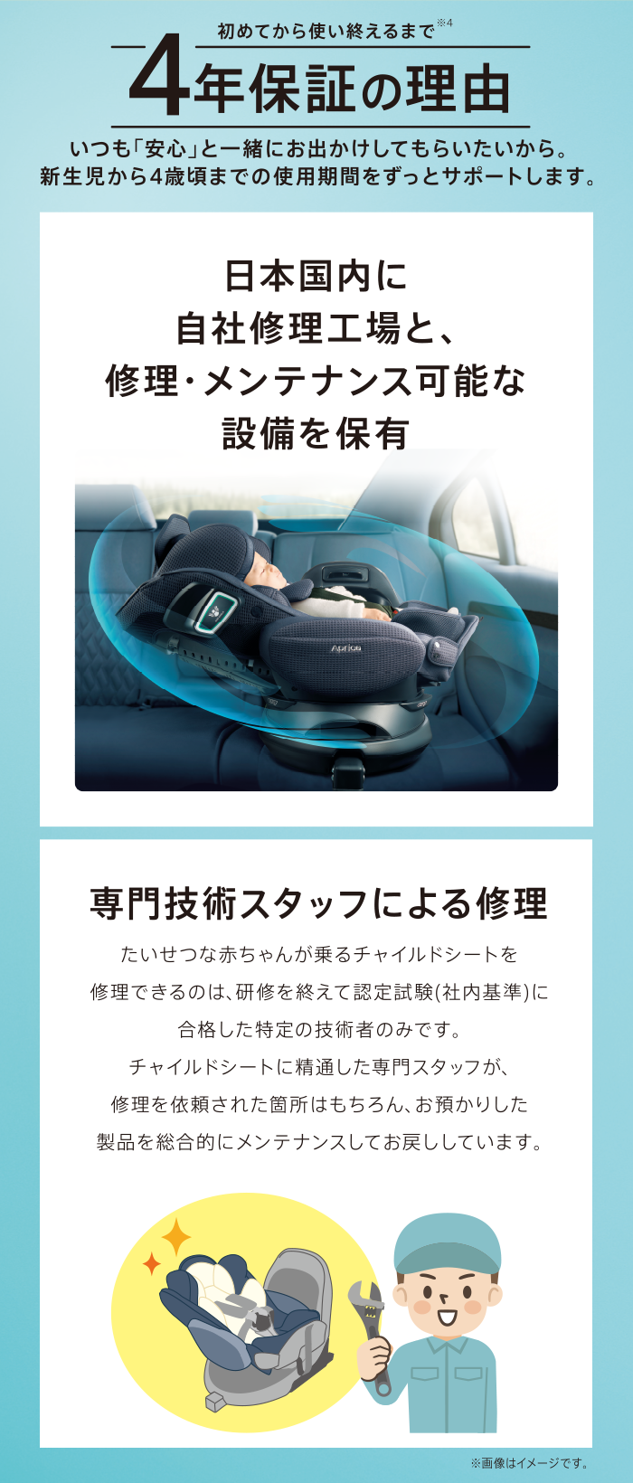 ※4 製品対象年齢 新生児から4歳頃までの使用期間が約4年間であることに基づく。保証期間は購入日より4年間です。